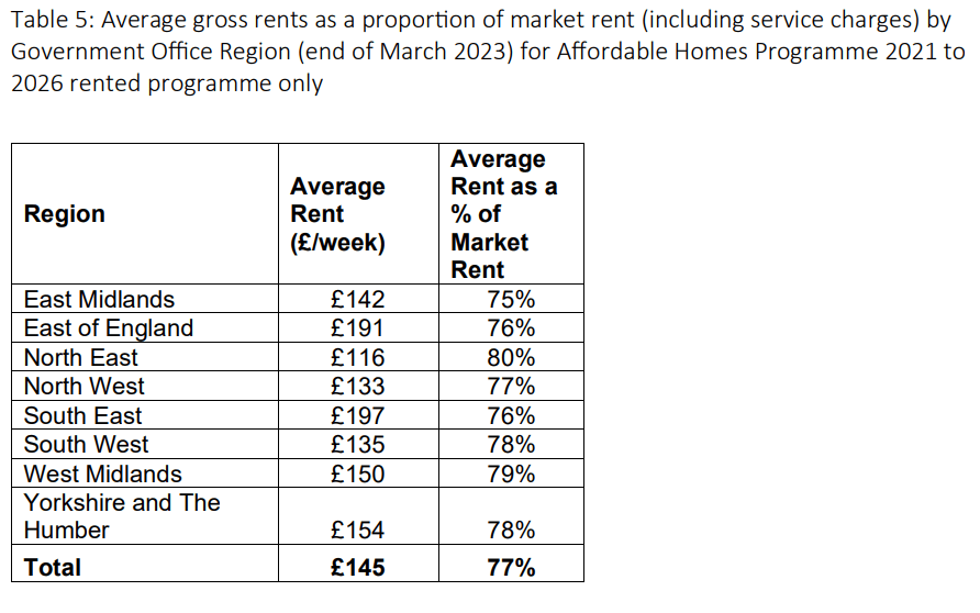 Homes England’s Summary Report to the end of March 2023 poses a question in relation to the rent levels resulting from their funding. In all the English Regions (excluding London) rents, including service charges are not far short of 80% or market rents, averaging 77%.
