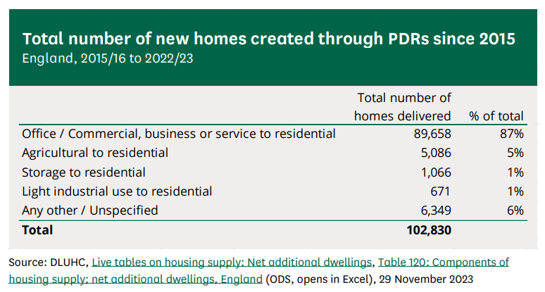 According to a House of Commons Library Briefing paper, between 2015/16 and 2022/23, 102,830 new homes were delivered through change-of-use Permitted Development Rights without planning permission. Most of these homes (89%) were created through conversion of offices, other commercial business and retail units. They comprised around 6% of the net additional homes delivered between 2015/16 and 2022/23.
