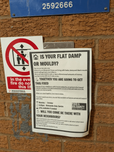 Food & Solidarity organisers worked with Abdul to pursue a collective response. They planned a door-to-door visit across Breamish House to find other residents affected by leaks, damp, or mould. Volunteers worked in pairs. One peron spoke with residents while the other recorded details and sign-ups. The aim was to gather evidence, collect names for a joint letter, and identify neighbours willing to attend a meeting with the council.